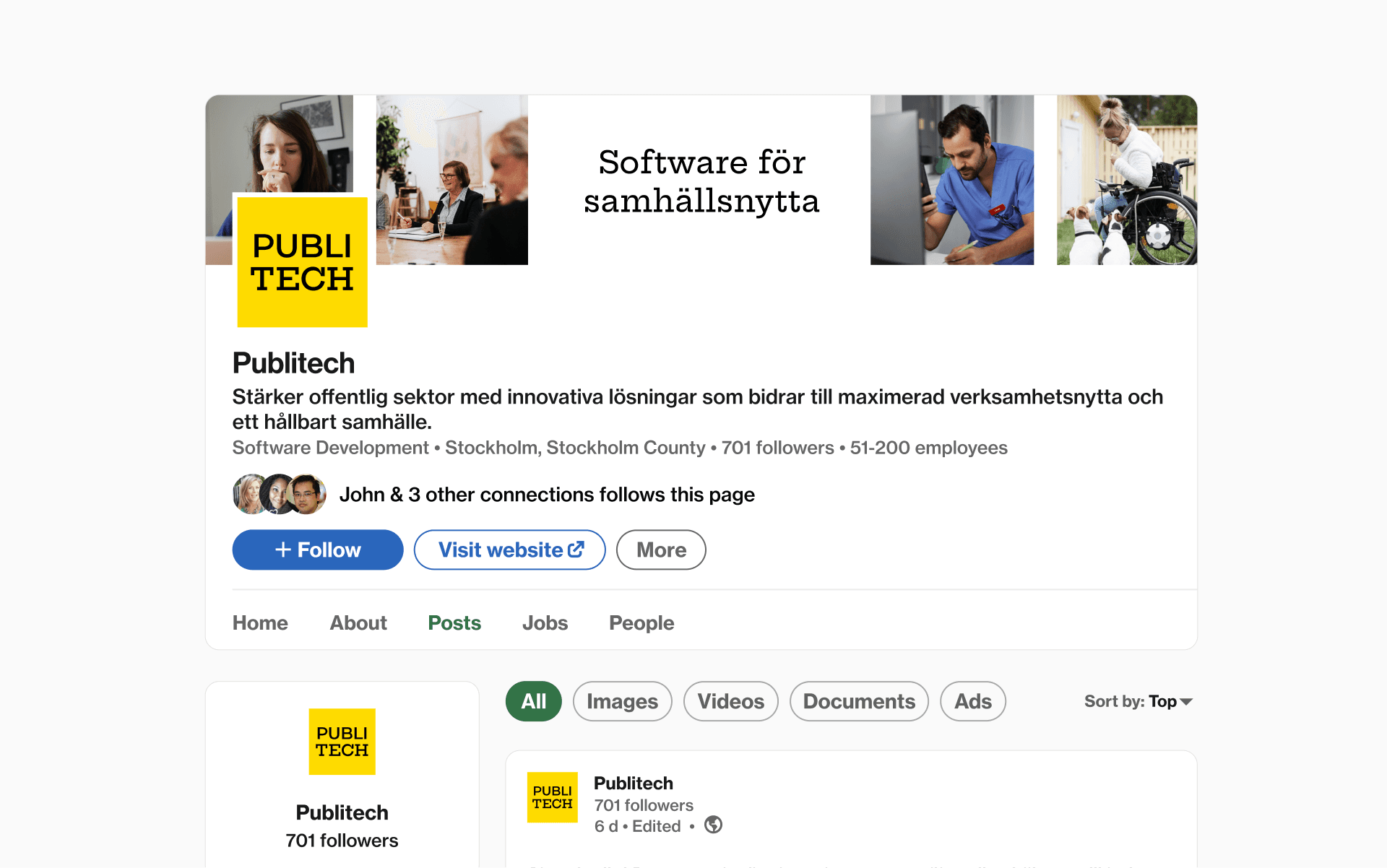 Firma tworząca oprogramowanie, która stawia sobie za cel uczynienie szwedzkiego sektora publicznego najlepszym na świecie poprzez dostarczanie elastycznych i bezpiecznych systemów administracyjnych dla pracowników szpitali, urzędów, czy policji. Publitech oferuje rozwiązania w chmurze w zakresie HR, finansów i zarządzania, które tworzy we współpracy z samorządami. Obsługuje systemy dla 30 tys. lekarzy i realizuje wypłaty ponad 850 tys. pensji w sektorze publicznym.